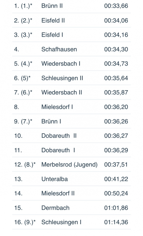 Einen hervorragenden 2. und 3. Platz belegten unsere beiden Mannschaften bei den offenen Stadtmeisterschaften Schleusingen im Löschangriff Nass , welche auch gleichzeitig als Kreisausscheid des Landkreises Hildburghausen gewertet wurden.