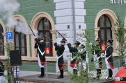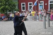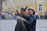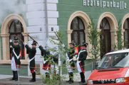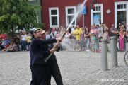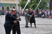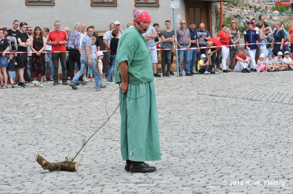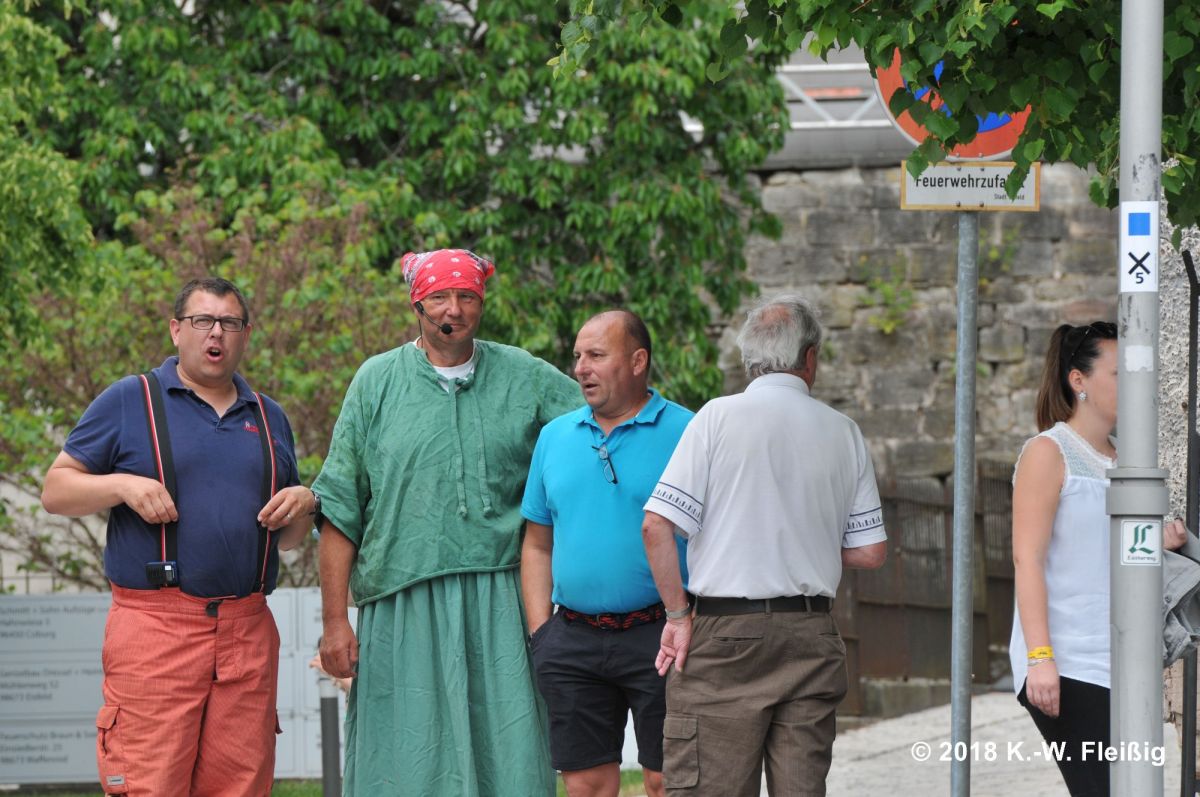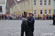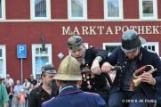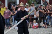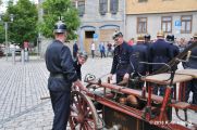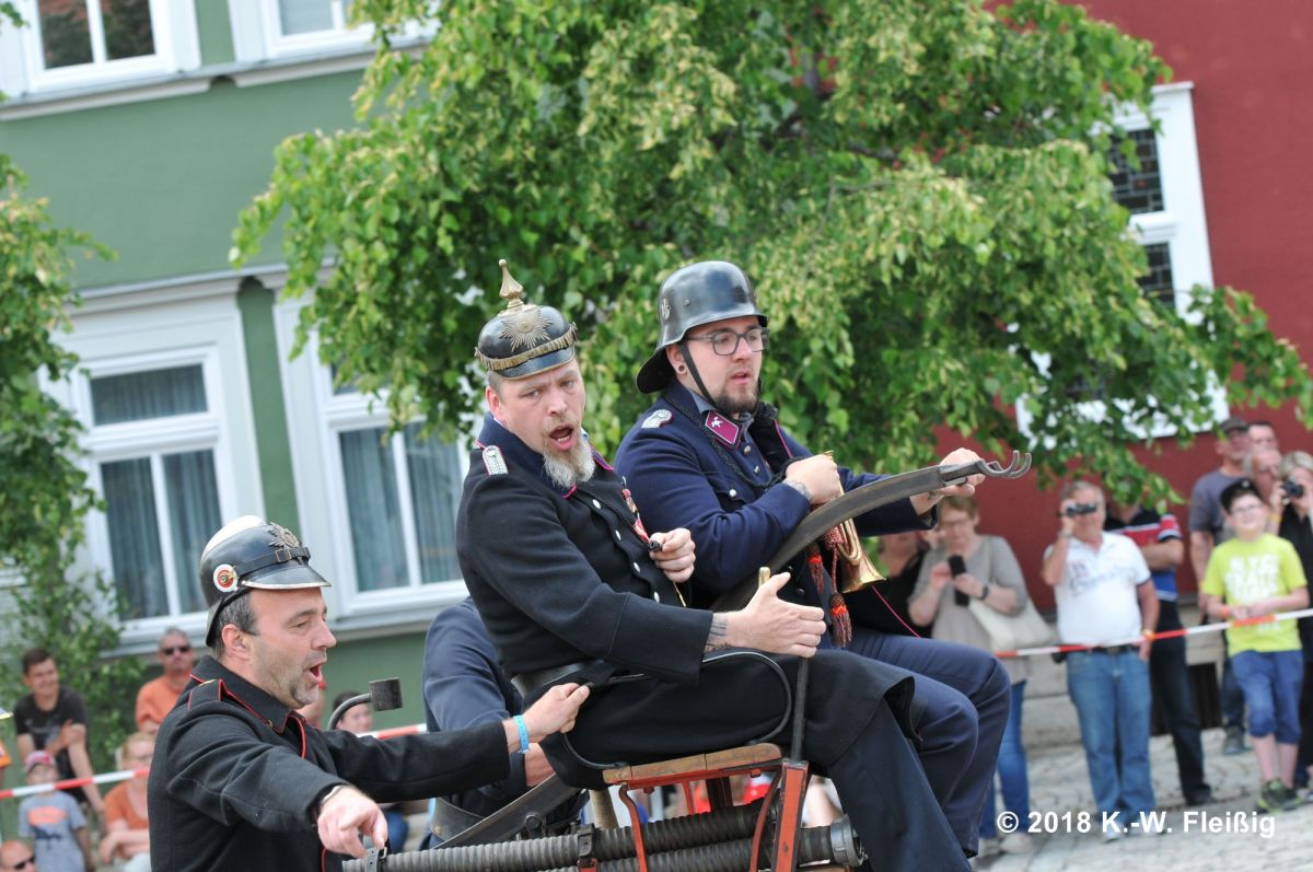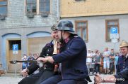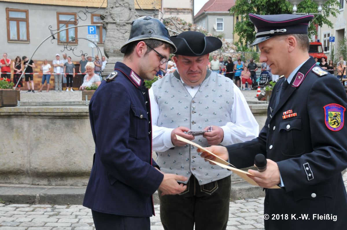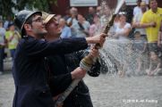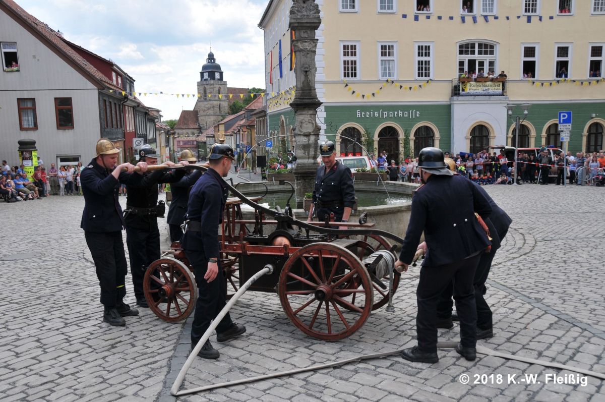 In diesem Jahr ertönte allerdings nicht wie üblich die Sirene zur Eröffnung der Feuerwehrübung. Die Gäste auf dem Marktplatz erwartete eine realitätsnahe Alarmierung wie sie schon vor hunderten Jahren in Eisfeld üblich war. Der Turmbläser auf dem Schloßturm verkündete mit seiner Fanfare ein Feuer. Die Alarmierungskette nimmt nun seinen Lauf. Die Trommler alarmieren die Löschmannschaften im Stadtgebiet, ebenso wird die Alarmkanone am Stelzener Berg in Stellung gebracht. (Hier "dargestellt" von der Stadtwache mit ihren neuen Gewehren) Ein Schuss-Überland (Coburg,Sonneberg,Hildburghausen) Zwei Schüsse-Umland (Harras, Waffenrod, Brünn, Lautertal) Drei Schüsse-In der Stadt brennt es !!!