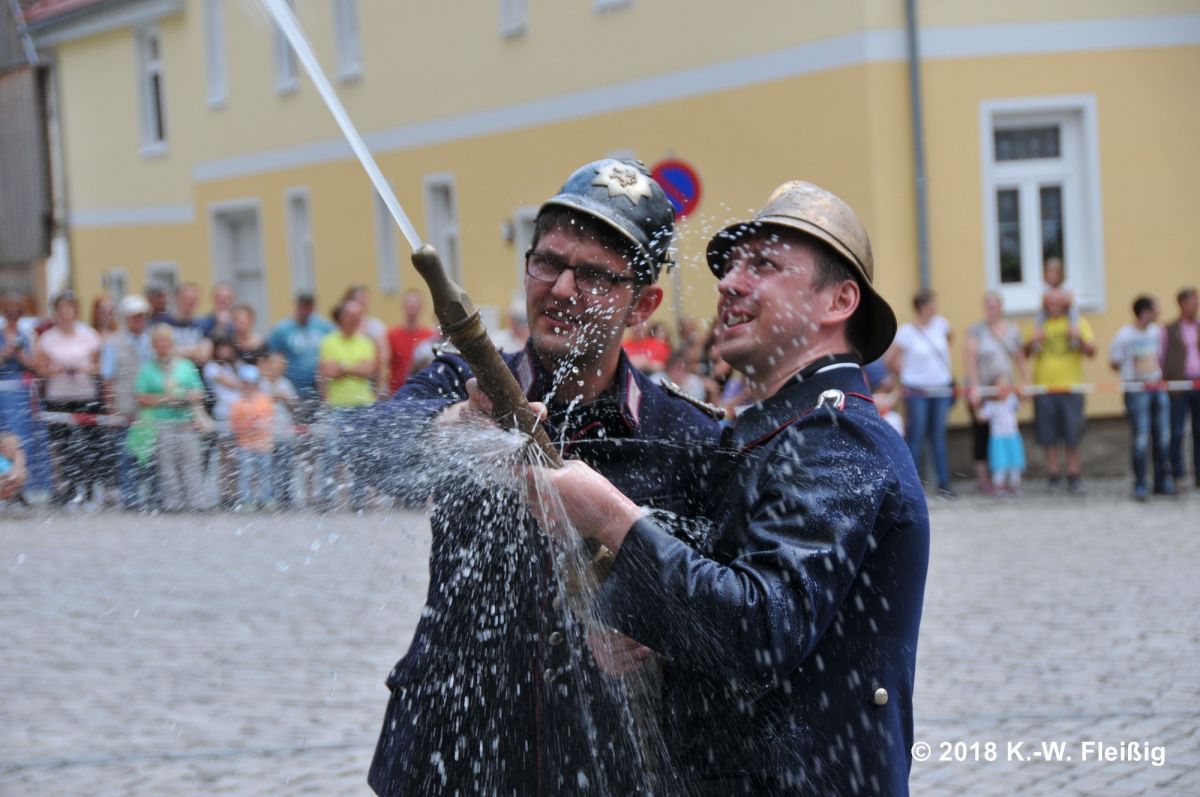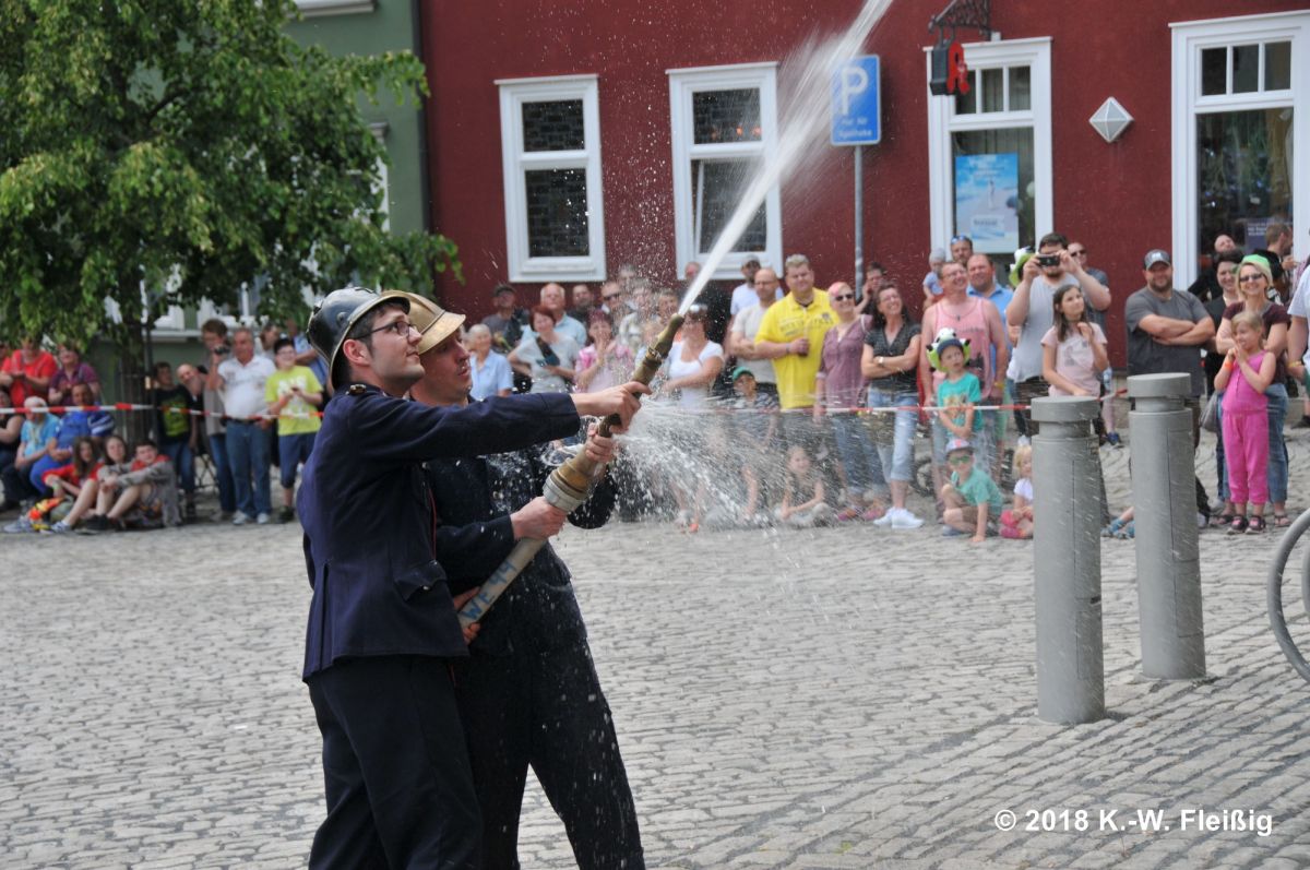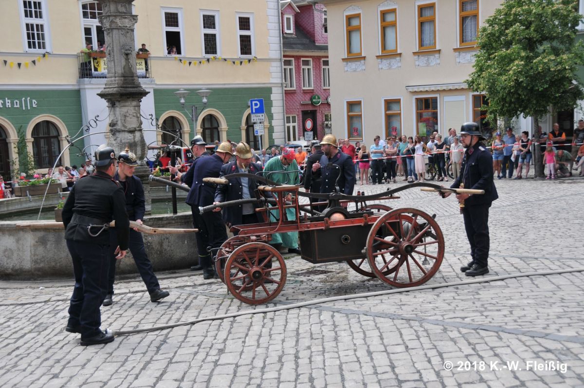 Die Löschmannschaft der Spritze legt am Marktbrunnen an und bekämpft den Brand im Deutschen Haus. Wussten sie schon...?