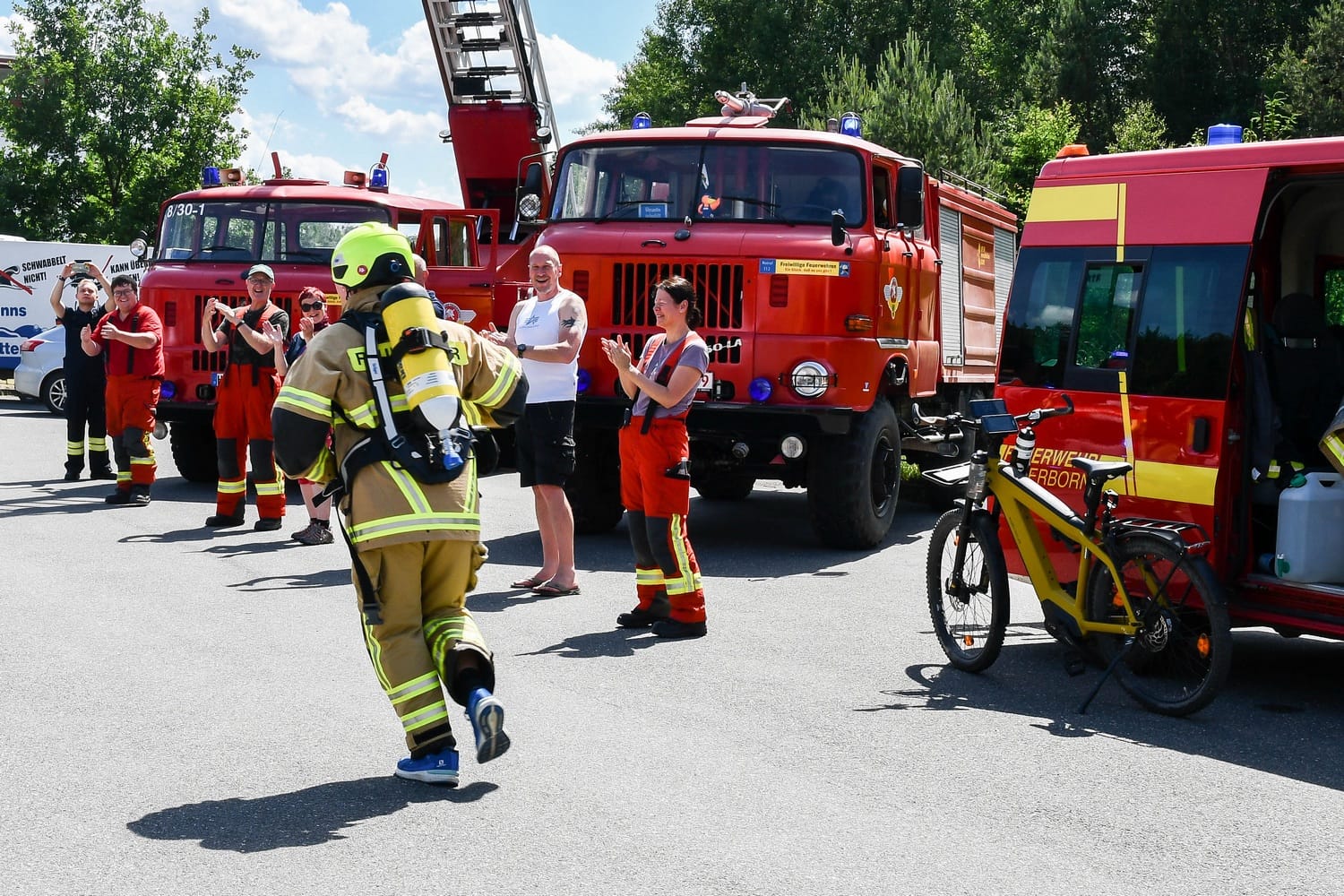 Er und 11 weitere Feuerwehrkameraden aus der ganzen Republik laufen (rennen) im Staffellauf und in voller Montur den ehemaligen Grenzstreifen (Grünes Band) entlang. Ziel ist es die 1200km lange Strecke in ca. 10 Tagen zu bewältigen. Am Sonntag (10.06.) war eine der Staffelstabübergaben an Frank bei uns in Eisfeld an der AGIP Tankstelle, die ja bekanntlich direkt am ehemligen Grenzübergang liegt. Als Staffelstab dient ein Pressluftatmer, der das Gewicht und damit die enorme Leistung der Beteiligten noch einmal erhöht. Zur Unterstützung beim Heimspiel kamen viele Kameradinnen und Kameraden unserer Wehr und vom Verein. Eine tolle Aktion - Hochachtung und Respekt für alle Beteiligten. Wer die Truppe und deren Anliegen unterstützen will, kann gerne an die Deutsche Krebshilfe spenden. Dafür machen die Jungs es ja.