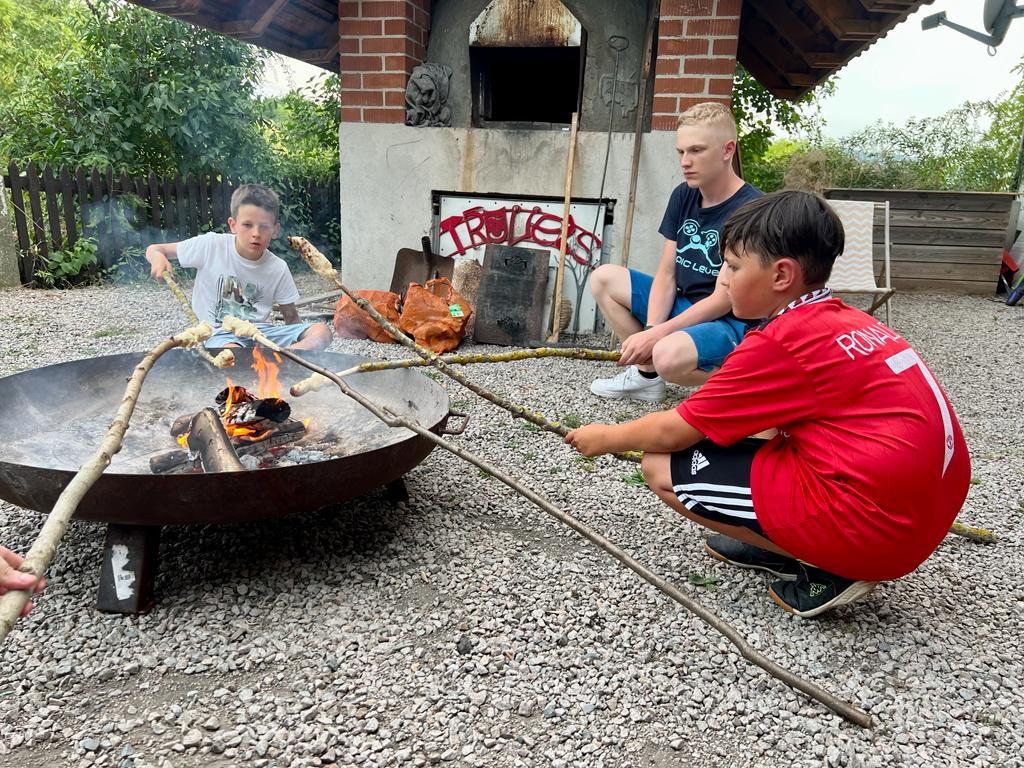 Abfahrt zurück zur Unterkunft! Schließlich galt es noch, für das am Abend geplante Stockbrot Stöcke zu sammeln. Direkt am Saaleufer wurden wir schließlich fündig. Alle wurden versorgt und unser Weg führte steil bergauf zurück zur Truppelsburg. Unter professioneller Feuerwehraufsicht wurde ein kleines Lagefeuer entzündet und der Abend klang gemütlich mit Stockbrot und anderen Leckereien aus.