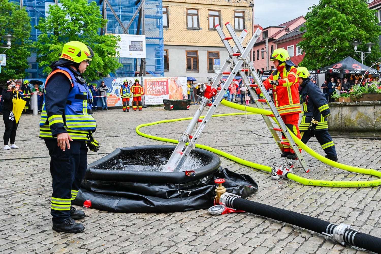 Auch in diesem Jahr fand zum Eisfelder Kuhschwanzfest eine Schauübung der Feuerwehr Eisfeld auf dem Marktplatz statt. Trotz Starkregen und Unwetterwarnung, wurde beim Eisfelder Kuhschwanzfest am Programmablauf festgehalten. Die Feuerwehr und Jugendfeuerwehr Eisfeld führten um 14.00 Uhr ihre Schauübung auf dem Eisfelder Marktplatz vor. Thema war diesmal die Vorstellung des neuen LF20-KATSCHUTZ und dessen Möglichkeiten speziell im Bereich Waldbrand-Schutz. Im Anschluss an die Übung wurden traditionell neue Kameradinnen und Kameraden in die Jugendfeuerwehr aufgenommen, Auszeichnungen und Beförderungen überreicht.